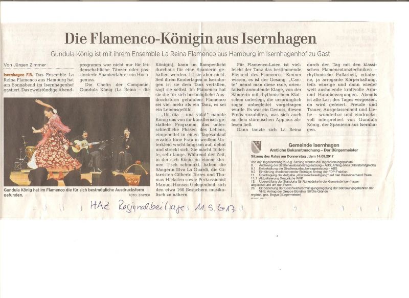 HAZ 09/2017 "Die Flamenco-Königin aus Isernhagen" Das Ensemble La Reina Flamenco gastierte mit seinem Programm UN DÍA UNA VIDA im Isernhagenhof